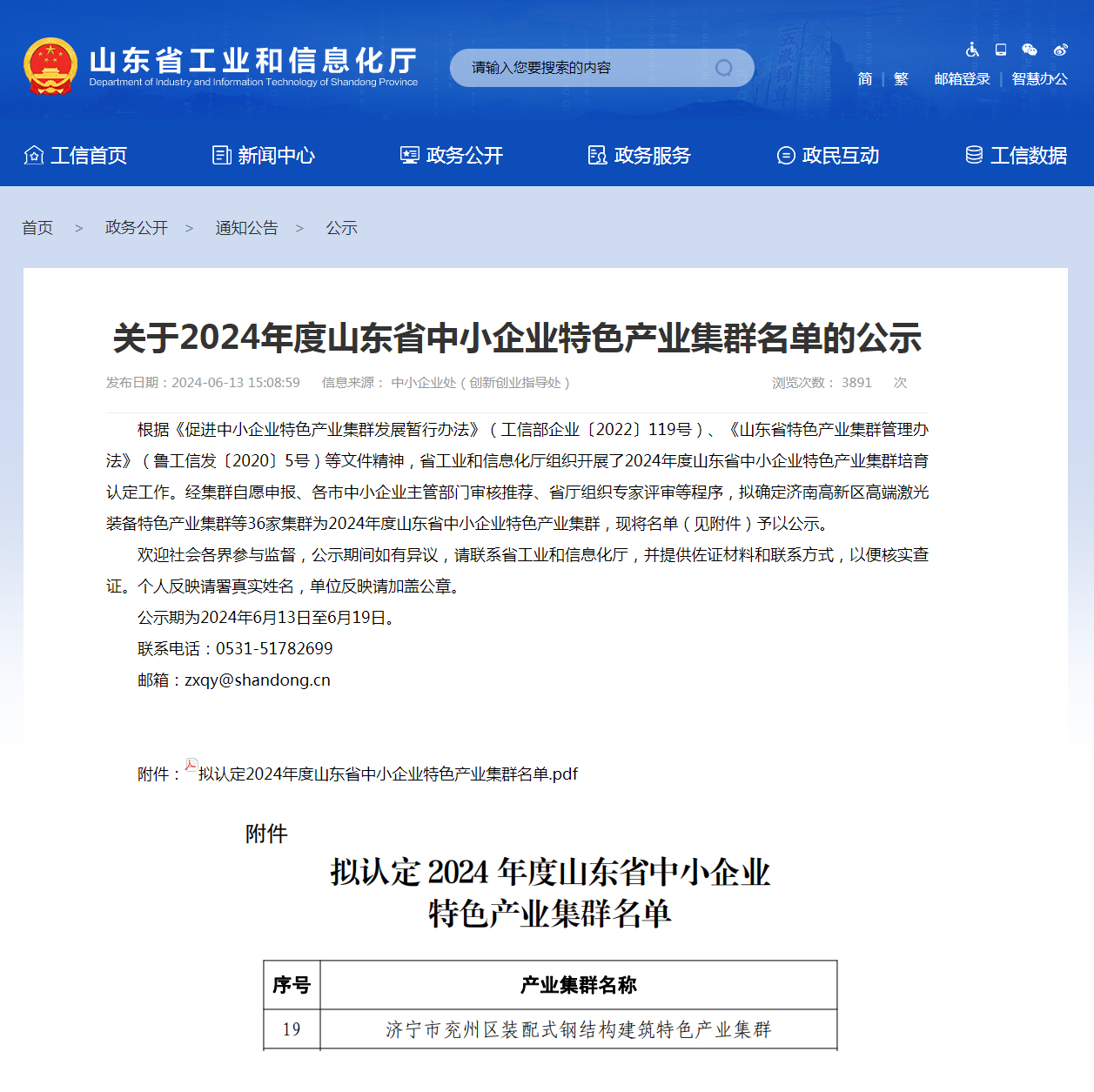 近日,山東省工業(yè)和信息化廳公布了2024年度山東省特色產(chǎn)業(yè)集群公示名單,全省共36家集群入圍。以經(jīng)典重工集團股份有限公司為主體的濟寧市兗州區(qū)裝配式鋼結(jié)構(gòu)建筑特色產(chǎn)業(yè)集群成功入選。