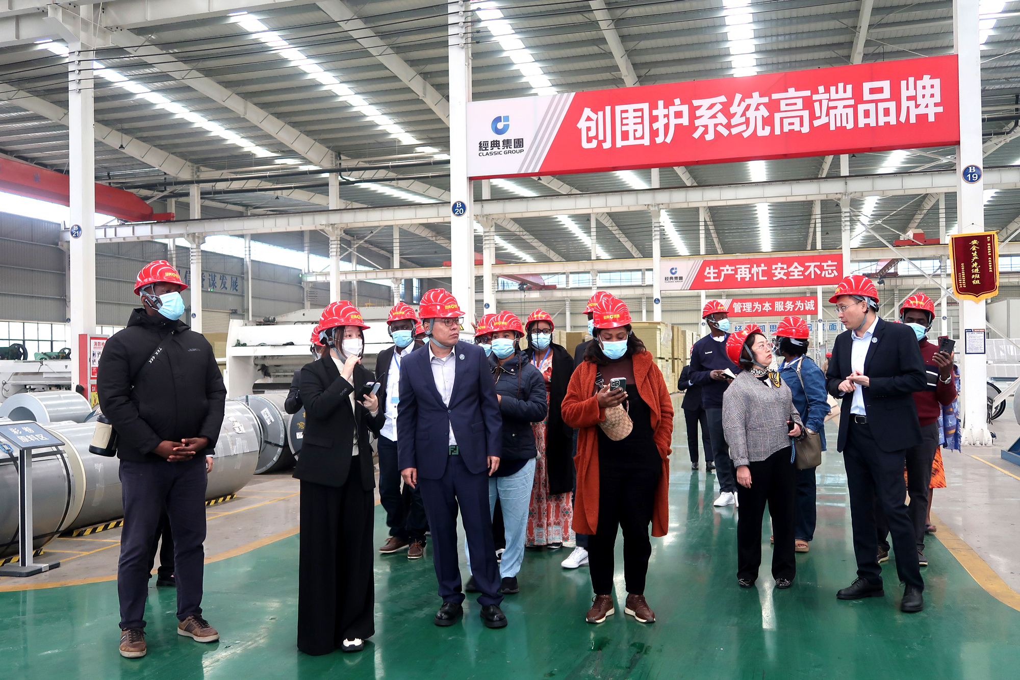 10月22日上午,商務(wù)部援外培訓(xùn)項(xiàng)目“科特迪瓦中高級(jí)外交官研修班”一行20余人,在山東外貿(mào)職業(yè)學(xué)院國(guó)際官員研修學(xué)院院長(zhǎng)王保紅帶隊(duì)下,蒞臨經(jīng)典集團(tuán)就工業(yè)發(fā)展經(jīng)驗(yàn)、中外經(jīng)貿(mào)合作等方面的經(jīng)驗(yàn)做法進(jìn)行參觀交流。經(jīng)典集團(tuán)副總經(jīng)理兼生產(chǎn)總監(jiān)張琦、副總經(jīng)理侯士輝等陪同。