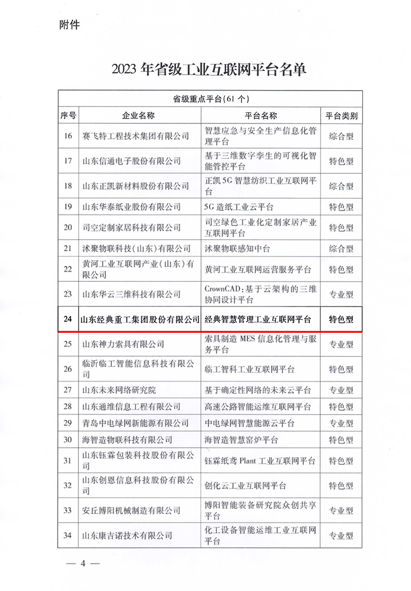 近日,山東省工業和信息化廳發布了《2023年省級工業互聯網平臺名單》,山東經典重工集團股份有限公司“經典智慧管理工業互聯網平臺”成功入選山東省級工業互聯網重點平臺名單。