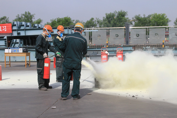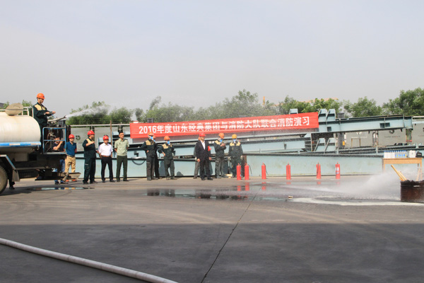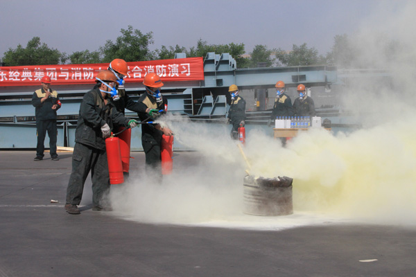 演習前,公司董事長苗樹文作了動員講話,對演習活動進行了部署。伴隨著消防警報響起,演習正式開始。消防應急救援隊立即集合,全副武裝到達指定地點,完成疏導交通和消防警戒,建立了應急通訊,集團領導下達救援命令后,一組救援人員手持干粉滅火器對準火源根部由近及遠進行掃射,迅速撲滅了火苗,二組救援人員使用高壓水槍對火源進行噴射,同樣達到了滅火的目的。演習結束后,區(qū)消防大隊趙怡然隊長對演習進行了指導點評。總經理杜福生對消防演習進行了總結,對消防安全工作提出具體要求。