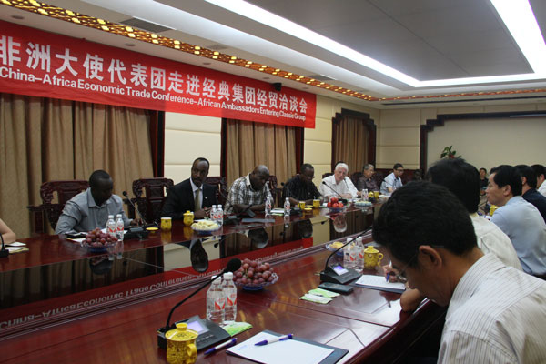 駐華大使們參觀了經典集團的生產車間、辦公樓、職工培訓中心、宴會廳、愛心超市和千人職工餐廳。苗董事長向非洲客人介紹了經典集團的生產經營、技術創新、產學研合作、人才引進培養、企業文化建設、經典產業發展等有關情況。大使們對經典集團的科學化、信息化、現代化的企業管理給予高度評價,對經典集團在飛速發展中取得的成就表示欽佩。