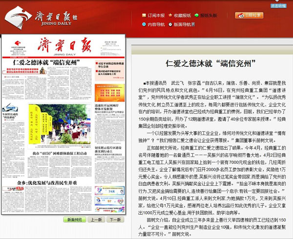 正如苗樹文所說,經(jīng)典重工的仁愛之德結(jié)出了碩果。今年4月,經(jīng)典重工的名號伴隨著她的一名普通員工———吳振興的名字響徹齊魯大地。4月2日經(jīng)典重工電工組工人吳振興在回家路上拾到一個裝有7000元現(xiàn)金的錢包,幾經(jīng)周折歸還失主。企業(yè)了解情況后專門召開2000多名員工參加的表彰大會,獎勵他1萬元愛心獎金。令人頗感意外的是,吳振興沒將這筆獎金帶回家,而是捐給了兗州的白血病患者文利。吳振興捐獻(xiàn)獎金讓企業(yè)上下震撼。“拾金不昧本身就是高尚的行為,又把獎金捐給需要的人,連續(xù)善行給集團(tuán)一個啟示:有錢一定要回報社會。”苗樹文說。4月10日,經(jīng)典重工派人來到文利家,為她捐款1萬元,又來到吳振興家,給他父母1萬元獎金,感謝兩位老人培養(yǎng)出品行如此優(yōu)秀的兒子。企業(yè)又拿出1000萬元成立愛心基金,用于扶困助殘、助學(xué)治病等。