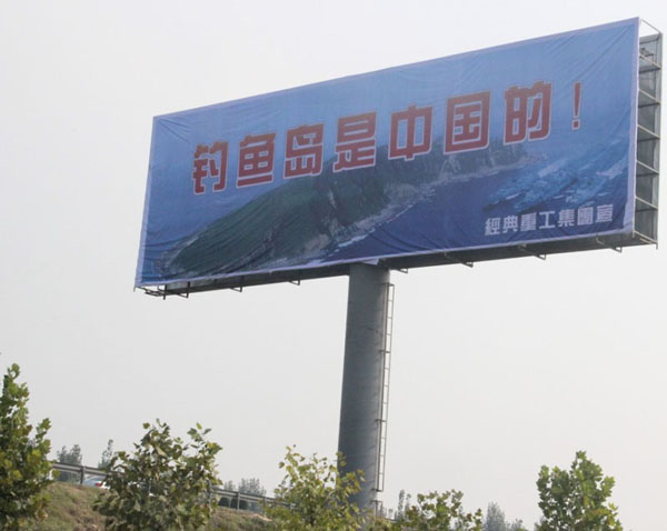 近一段時期以來日本推出了所謂的“購島”無恥行徑,刺激了國人的神經,我們集團作為中華民族大家庭的一員,有責任也有義務保衛我們祖國領土的完整,和不容侵犯,為此集團領導代表集團全體員工通過各種方式彰示了我們的愛國熱情,并付諸于實際行動斥巨資在日蘭高速濟寧段制作了高炮廣告“釣魚島是中國的”以顯示我們保釣之決心。